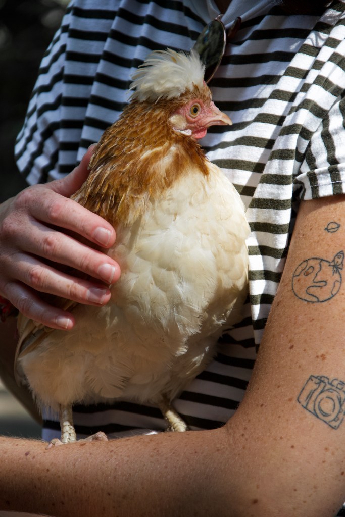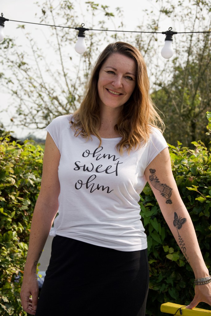 Als ik aanbel word ik hartelijk ontvangen door Ingrid. Ze heeft één van haar eigen yogashirts mooi gecombineerd op een rok. Op haar armen zitten sierlijke tatoeages. De liefde voor muziek vind je niet alleen terug op haar armen, maar ook in haar knusse huis en in de namen van haar kippen. Nina de kip begroet ons en de andere twee kippen, Ella en Billie zitten lekker verstopt onder de bank in haar geweldige grote tuin.