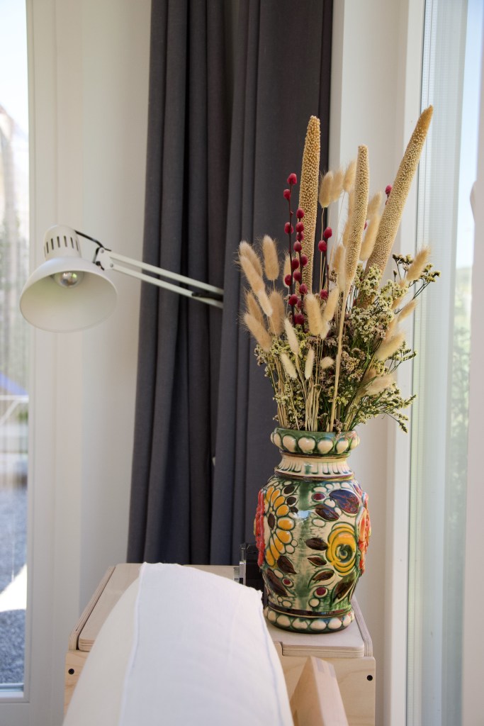 We zitten in een lichte ruimte met veel ramen. Op de achtergrond klinkt muziek van Matthew and the Atlas. In de rechterhoek is een keukenblok geplaatst en daarachter is een kleine badkamer. Via een steile kleine trap kom je boven, waar er voldoende ruimte is voor een tweepersoonsbed. Het is niet groot, maar het is van alle gemakken voorzien. Het huis heeft eigenlijk alles wat je nodig hebt. “In mijn vorige relatie draaide het vooral om materialisme. Er was overvloed. We hadden alles en dat terwijl we eigenlijk elkaar niet gelukkig maakte. We verschilde te veel. Het heeft mijn ogen geopend waar het voor mij in het leven om draait. In dit huis besef ik dat heel veel spullen mij niet gelukkig maken. Minderen met spullen maakt ruimte in mijn hoofd, zodat er ruimte kan ontstaan voor de dingen waar ik echt heel blij van word.”